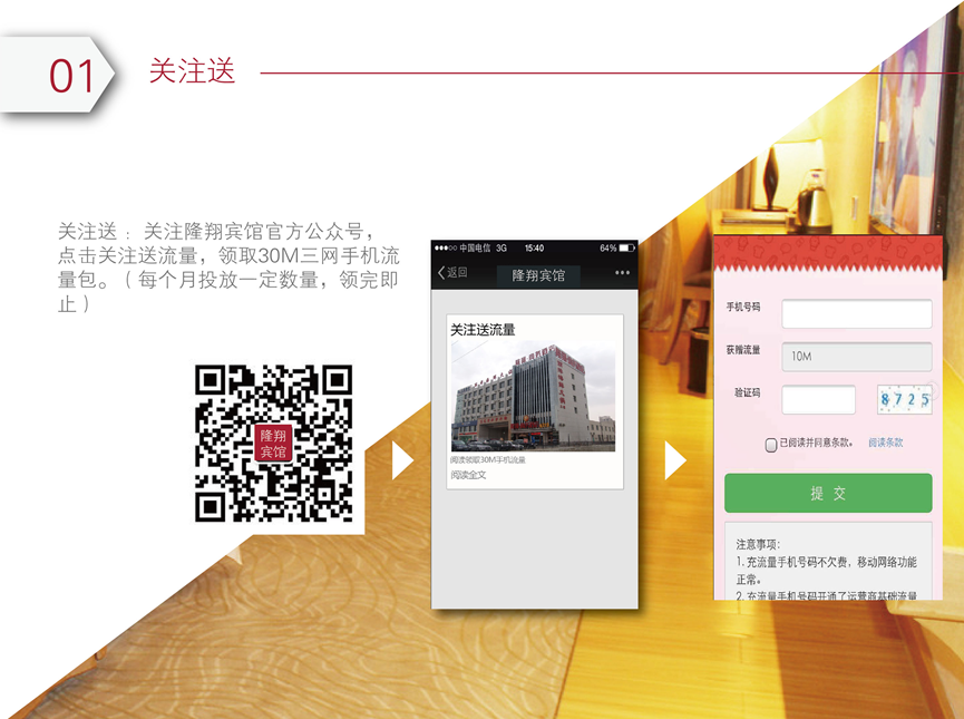 关注隆翔宾馆微信公众号送流量。