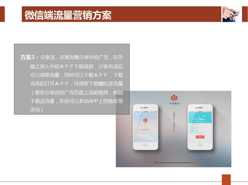 在朋友圈分享中信银行广告,在页面上加入中信银行APP下载链接,分享完成后可领取流量,同时可下载APP,下载完成后打开APP,可领取下载赠送的流量(要在分享送的广告页面上说明规则,例如下载送流量,并且可以参加APP上的抽奖等活动)。